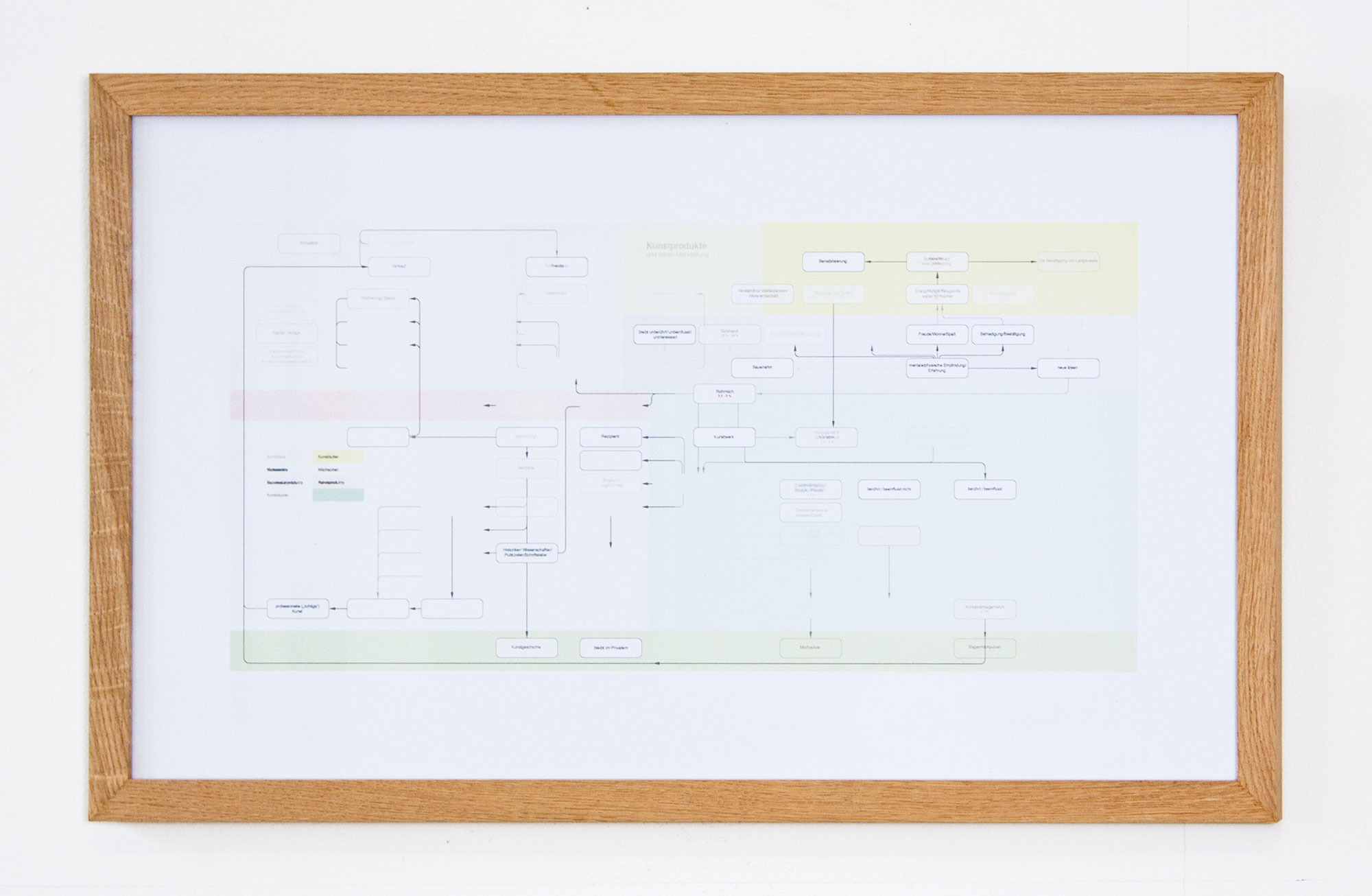 Anhand eines grafischen Gefüges zeige ich unterschiedliche Milcherzeugnisse auf; eine zweite Grafik schlüsselt unterschiedliche Kunstprodukte auf. In einer Animation stelle ich einen Zusammenhang zwischen beiden Bereichen her und blende die Grafik der Kunstprodukte über die der Milchprodukte. Partiell und sukzessiv beginnen so die Begrifflichkeiten aus der Kunst über denen der Milcherzeugnisse zu erscheinen, während die Milcherzeugnisse langsam verschwinden. Manche Bezeichnungen aus der Milchproduktion erhalten Entsprechungen – so findet „Mascarpone“ seine Entsprechung in „Geschmack“. Andere finden keinen begrifflichen Vergleich. An manchen Stellen tauchen auch ganz neue Begriffe aus dem typischen Kunstvokabular auf, wie etwa „Rezipient“ oder „Aura“.